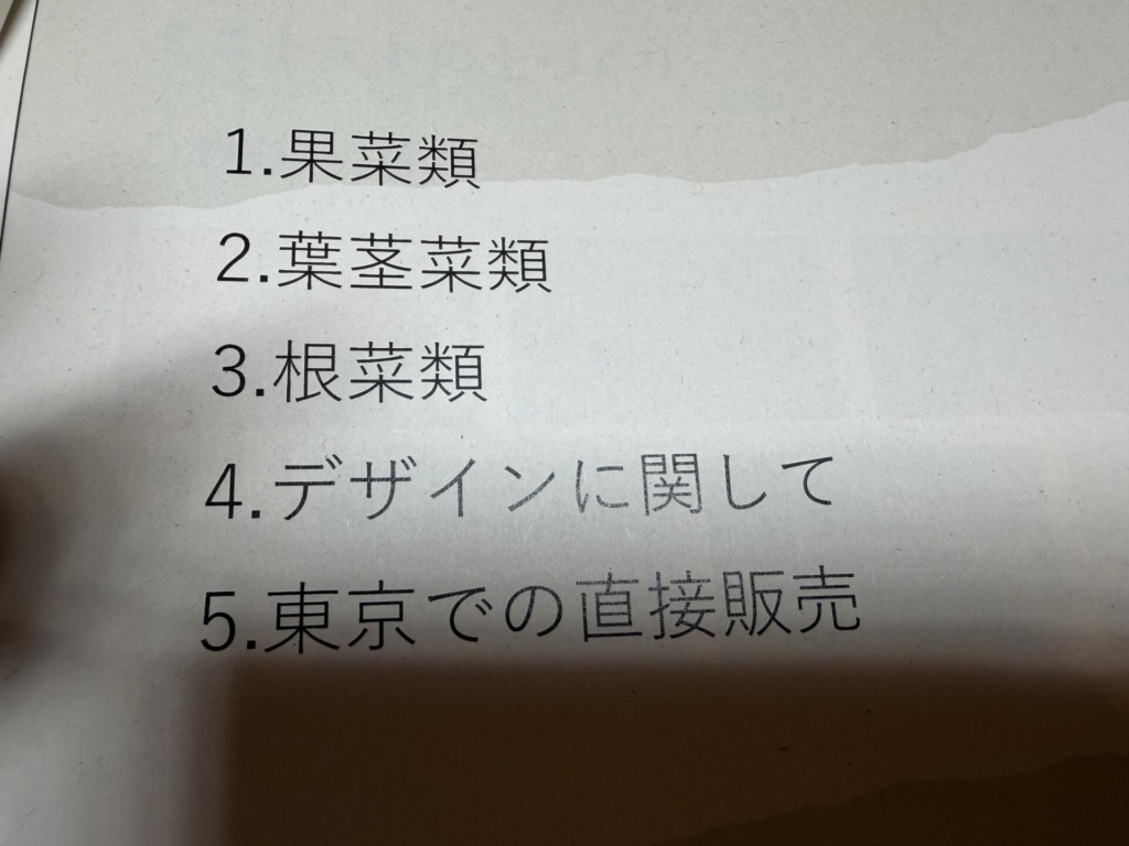 ほり農園の特徴は「多品目」「1年間野菜を切らさない」「米・野菜の自己販売」「家族経営➕雇用等」といったところでしょうか。この特徴を1年を通してメモを取り、実際に働き販売し、ほり農園の弱点と強み・さらには「より良くするには?」までまとめ上げていました。また、多品目の中からポイントとなる野菜を選定し深掘りをしていく!まさに専門職大学✨とても良く纏めていたように感じました👏ほんと素晴らしい‼️